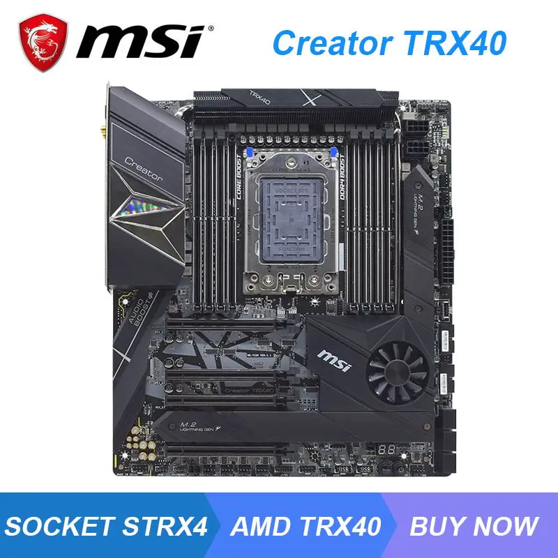 MSI Creator TRX40 sTRX4 AMD TRX40 SATA 6Gb/s Extended ATX AMD Motherboard . Number of Memory Slots: 8×288pin Memory Standard: Supports JEDEC 1R 3200/ 2666/ 2400/ 2133 MHz 1DPC 1R max speed 4666 MHz 1DPC 2R max speed 4000 MHz 2DPC 1R max speed 4000 MHz 2DPC 2R max speed 3600 MHz Audio Chipset: 1 x Realtek ALC1220 Codec 1 x Realtek ALC4050H Codec Audio Channels: 7 .1 Channels