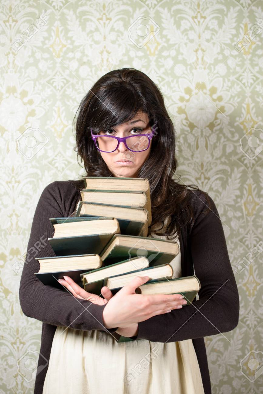 Felice bella studentessa con gli occhiali e la pila di . . .