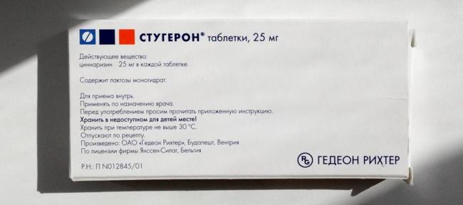 Торговое название препарата: СТУГЕРОН ® Международное непатентованное название: циннаризин Лекарственная форма: таблетки . Состав в 1 таблетке: действующее вещество: циннаризин 25 мг;
