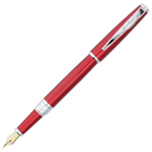 Matériau : laiton pour bijoux ; Type : plume ; Matériau du stylo : acier inoxydable ; Finition plume : or 18 carats ; Mécanisme d'ouverture : capuchon amovible ; Taille du stylo : M ; Épaisseur du trait : 0,5-0,59 mm ; Recharge : cartouches Pierre Cardin standards ou encre en bouteille à l'aide d'un convertisseur ; Épaisseur du boîtier : standard ; Longueur : 14 cm ; Couleur : rouge, argent ; Série : Secret ; Fabricant : Pierre Cardin, France.