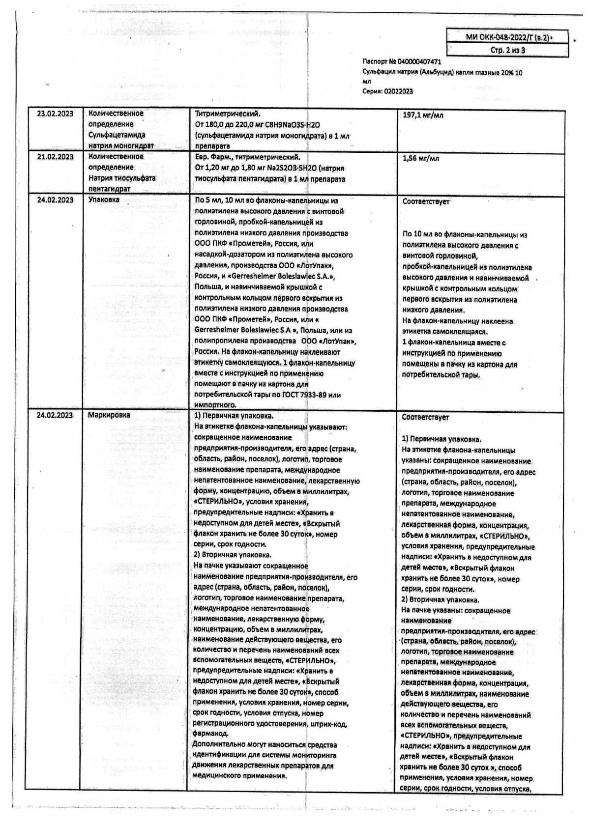Сульфацетамида натрия моногидрат - 200,00 мг Вспомогательные вещества: Натрия тиосульфата пентагидрат - 1,5 мг Хлористоводородная кислота раствор 1 М - до pH 7,5-8,5 Вода очищенная - до 1,0 мл Противопоказания Индивидуальная повышенная чувствительность к компонентам препарата, детский возраст (до 2 месяцев) . Подробное описание