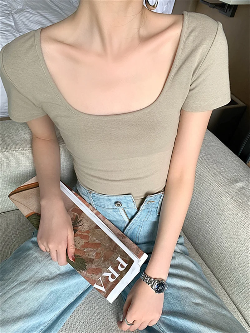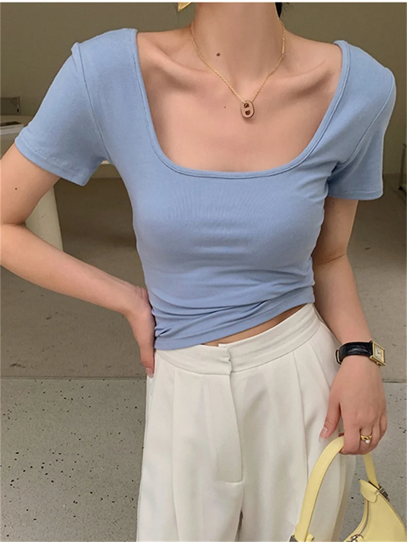 Summer Knitted Cotton Square Collar Crop Tops Raglan Short Sleeve Slim Soft Simplicity Solid Comfortable For Female Blouses - Купить с бесплатной доставкой