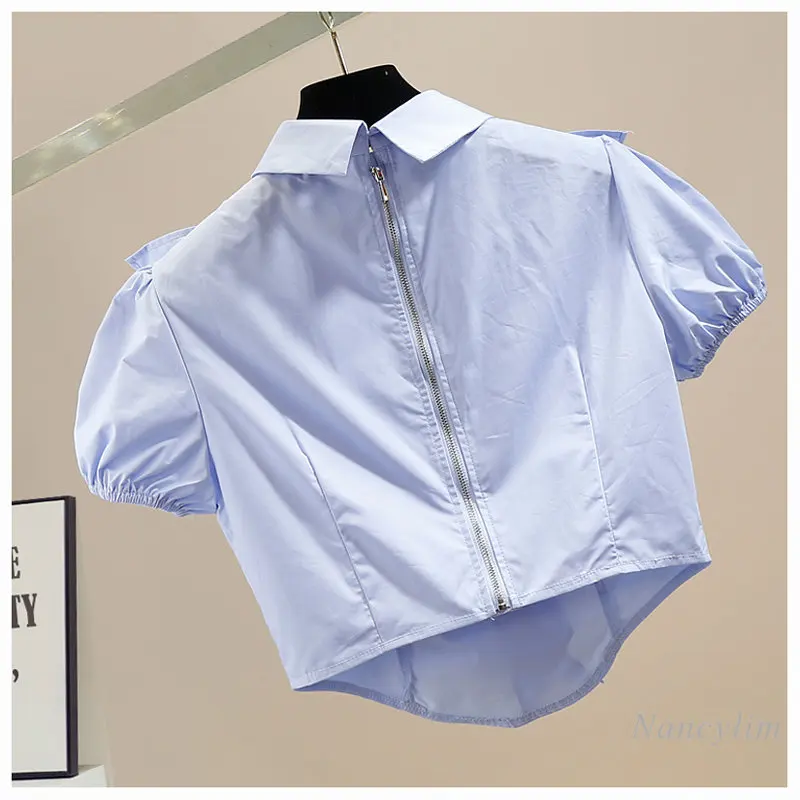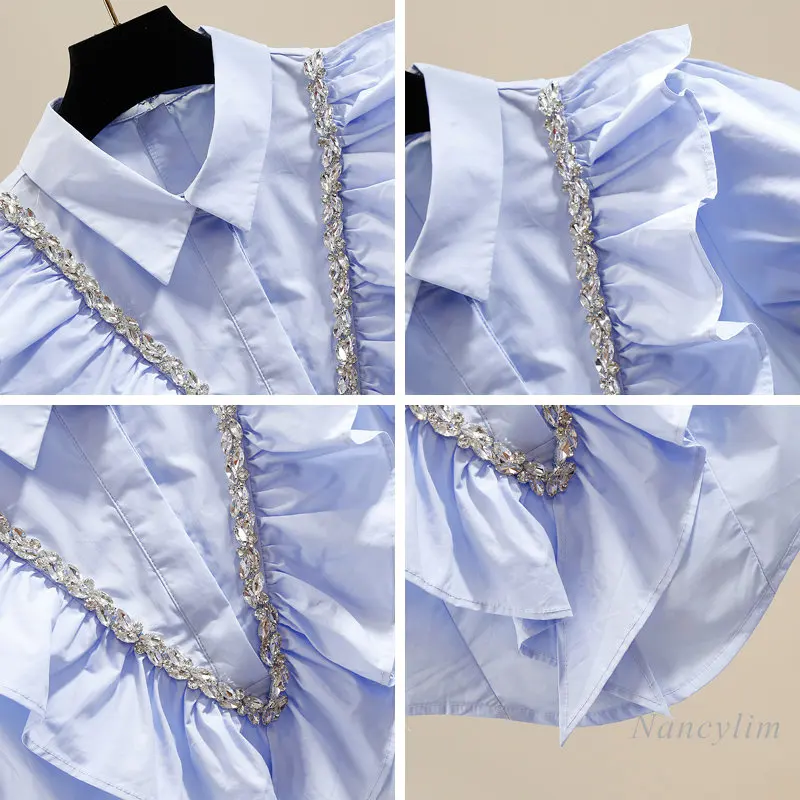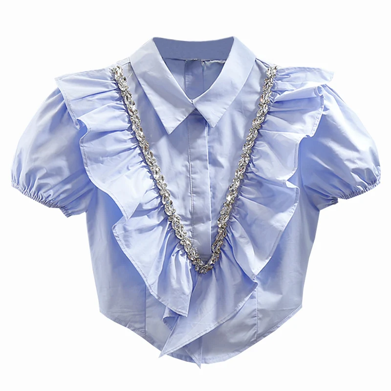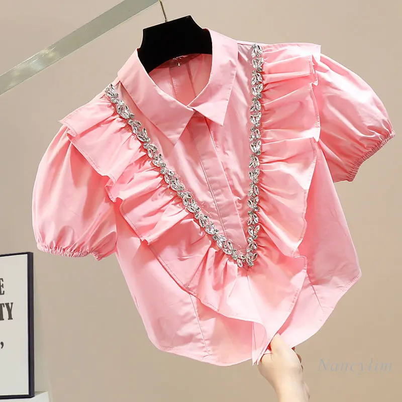 Summer Y2K Top Women Exquisite Rhinestone Sweet Pleated Three-Dimensional Ruffles Stitching Back Zipper Short Blouse Blusas 2023 - Купить с бесплатной доставкой