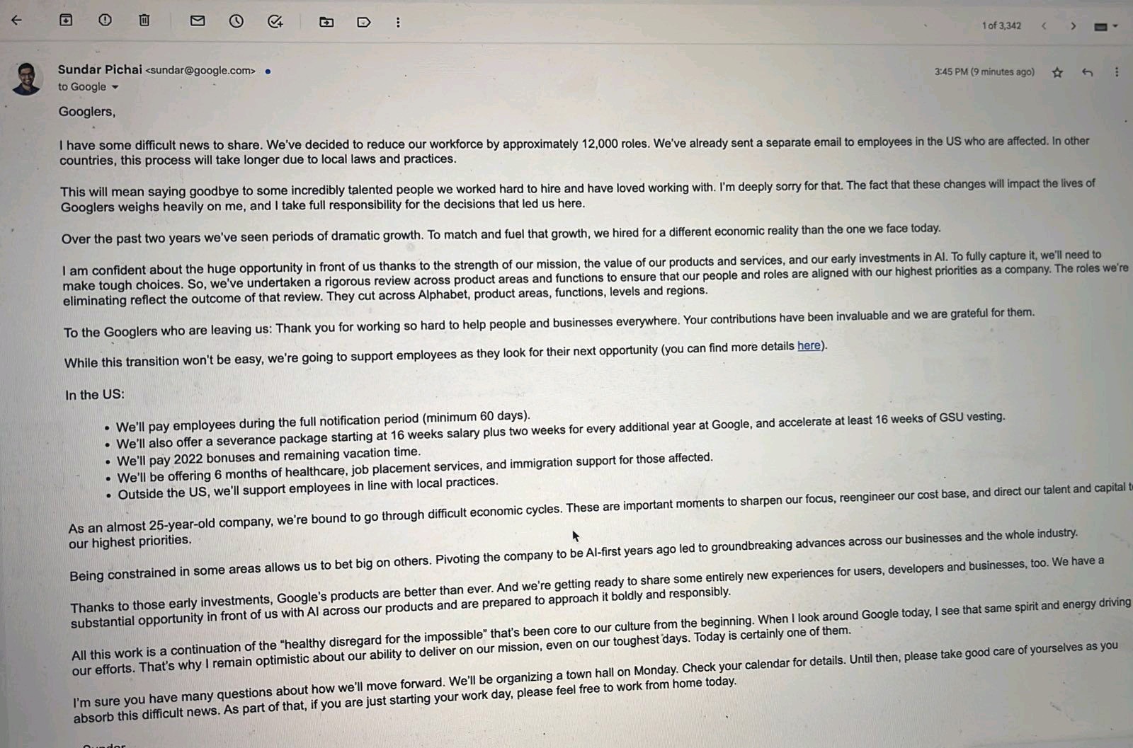 Sundar Pichai e-mail #googlelayoffs