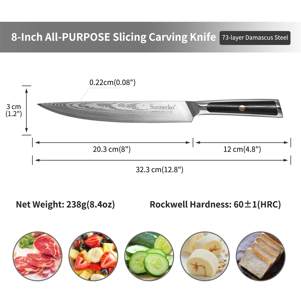 "Sunnecko 8'' Inch Slicing Kitchen Knife 73 Layers Damascus Steel vg10 Blade Chef Cooking Japanese Style Gift Box Accessory Tool" * Buy Now With Free Shipping Just For $56