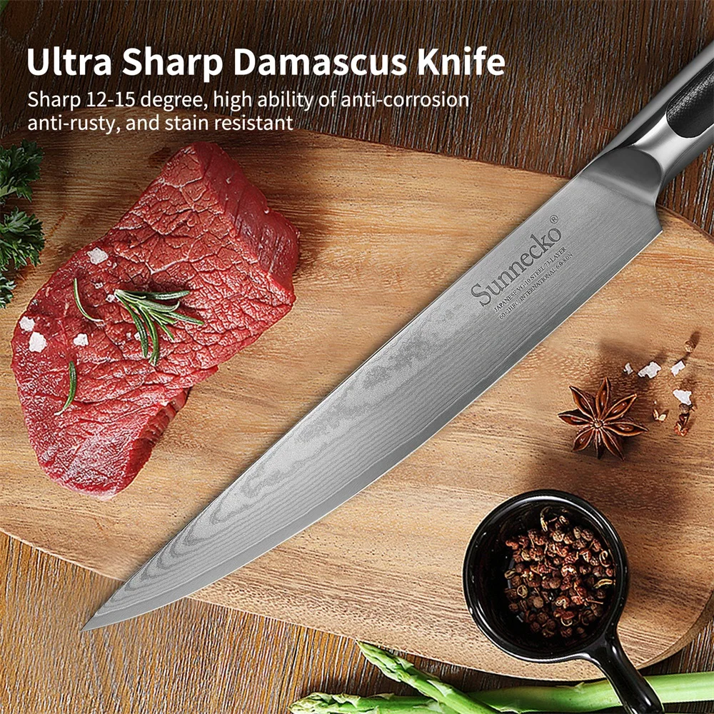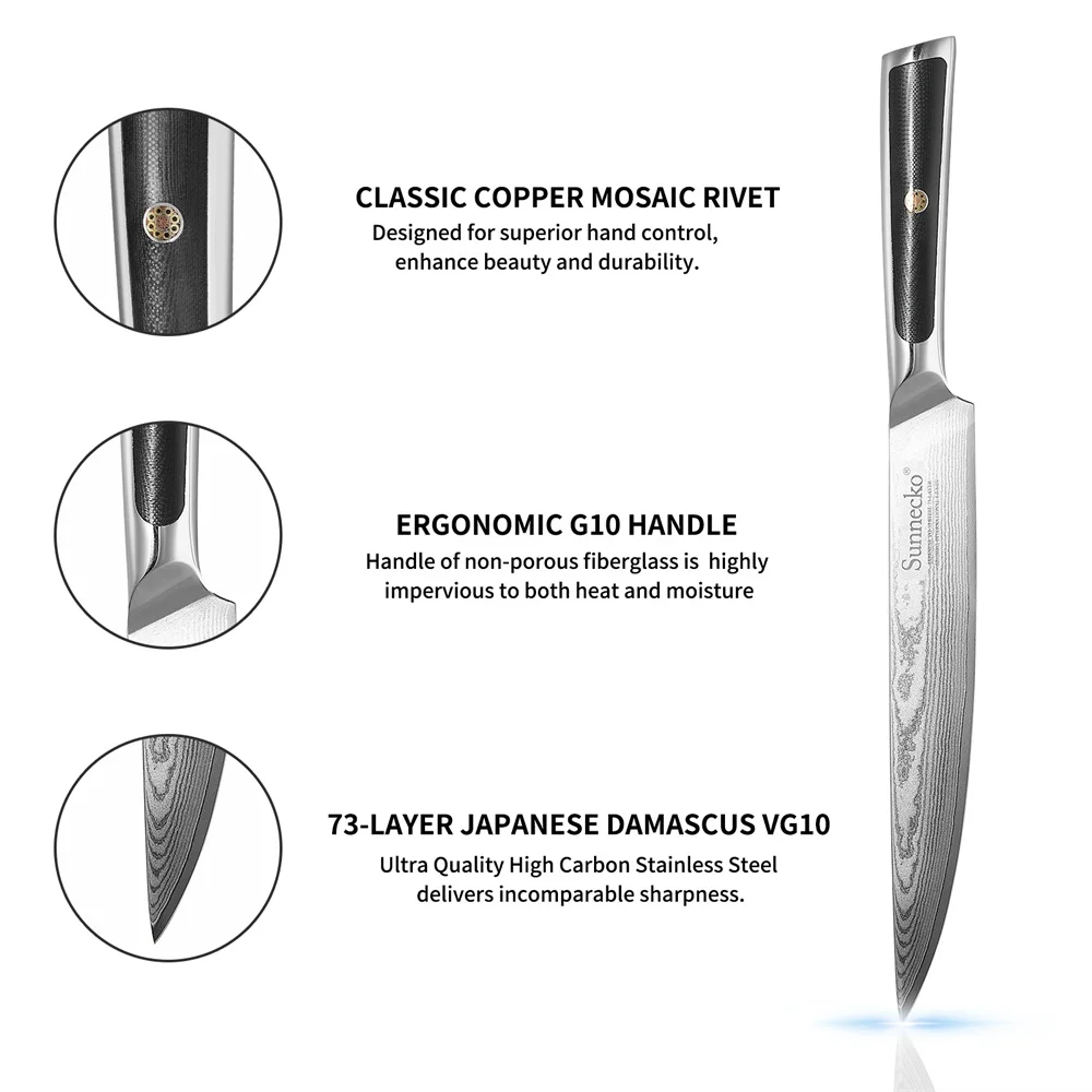 WiVxUhAhvHere you can buy Sunnecko 8'' Inch Slicing Kitchen Knife 73 Layers Damascus Steel vg10 Blade Chef Cooking Japanese Style Gift Box Accessory Tool with free delivery to your post office.