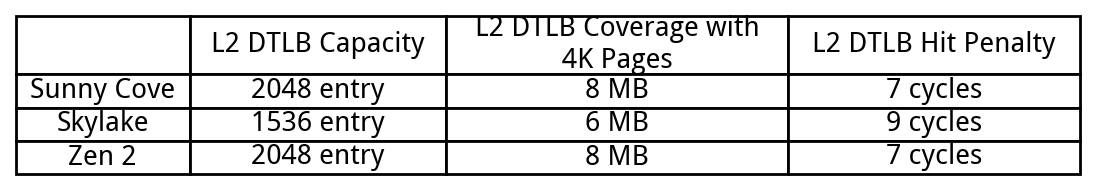 Sunny Cove improves address translation performance by using a larger L2 TLB. At the same time, it reduces L2 TLB latency. L2 TLB parameters thus become superficially similar to that of Zen 2, and a step above Skylake:
