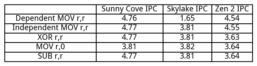 Sunny Cove can also recognize special cases of independence, like zeroing a register by XOR-ing it with itself. Of the cases we tested, SUB r,r and XOR r,r are both eliminated. They execute at 5 per cycle, even though Sunny Cove only has four ALU pipes. Interestingly, MOV r, 0 is recognized as independent, but not eliminated. Throughput for that instruction is still restricted by ALU port count.