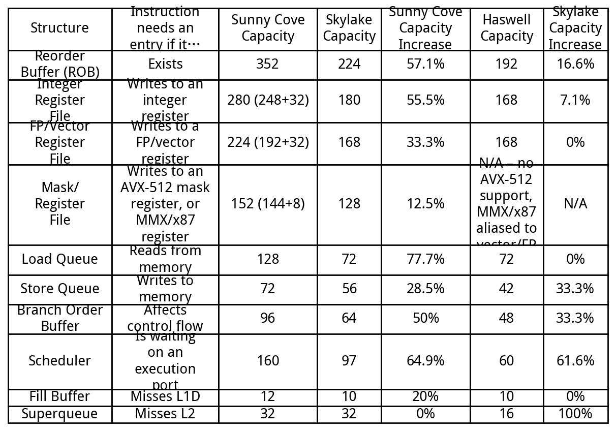 Sunny Cove makes huge structure size increases almost across the board, especially in key structures like the ROB, register files, and scheduler. Size increases beyond 50% are not uncommon. Skylake’s improvements over Haswell look small in comparison. Going back over previous generations, we can see how much Sunny Cove stands out: