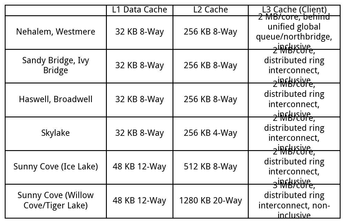 Sunny Cove shakes up Intel’s cache hierarchy for the first time in over a decade. Since Nehalem, Intel has used 32 KB L1 caches, and a fast 256 KB L2 mid-level cache to insulate the cores from a slower but much larger L3. Sunny Cove makes both caches bigger, and uses two L2 configurations within the same core architecture generation. Technically Skylake did this as well, but Sunny Cove is the first to have two L2 configurations within client parts.