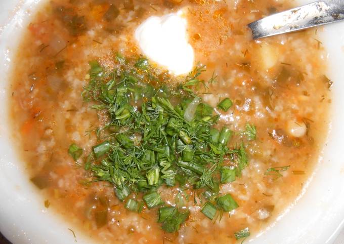 Фото-рецепты; . . . густой суп на мясном бульоне с рисом и овощами . Для придания нужной консистенции в рецепте есть мука и томатная паста . Красный перец, входящий в состав супа, придает блюду . . .