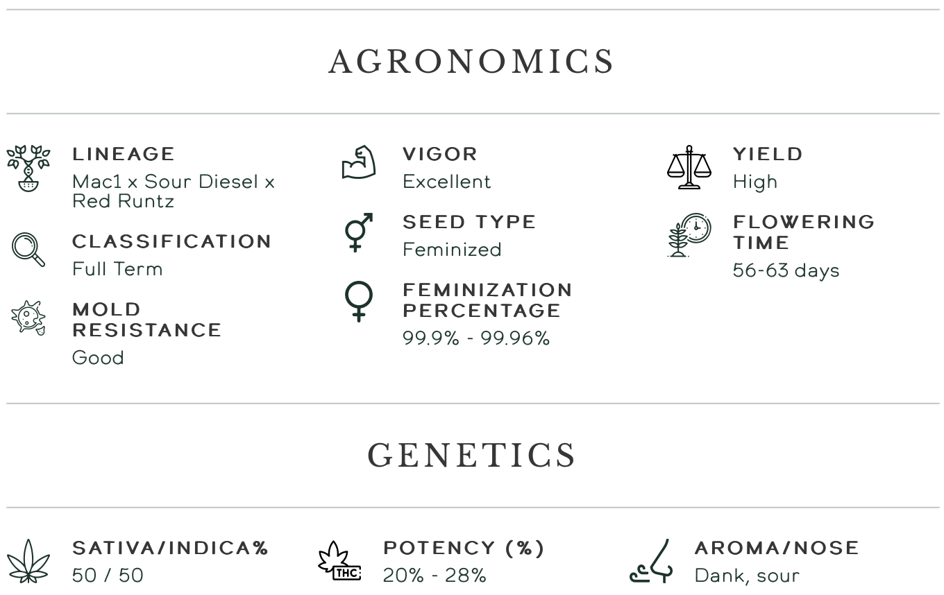 Цей крос був переданий нам з неймовірно багатогранної і добре опрацьованої генетичної бібліотеки Рона Херрінгтона з Gold Hat Seeds, селекціонера, що живе і працює в Альберті, Канада. Рон схрестив нью-джерсійський сорт Sour Diesel з кращим в загальній категорії переможцем Spannabis, Red Runtz. Потім він схрестив його зі своєю лінією Mac1 (Miracle Alien Cookies), яка походить з південного Орегону. Sour D / Red Runtz вирішив проблему надмірної розтягнутості, яку представляє Mac1. Вологий, трав'яний і кислий терпкий аромат. Однією з найкращих якостей цього кросу є те, що терпи зберігаються і покращуються з часом, що робить його вдалим вибором для комерційної життєздатності. Цей сорт має щільну структуру бутонів, що надає чудового вигляду готової квітки, але може спричинити появу плісняви під час дощів у пізньому періоді цвітіння. Це один з улюблених сортів Рона і буде одним з перших його генетичних сортів, які ми випустимо влітку 23-го року в рамках проекту Future Cannabis Project.