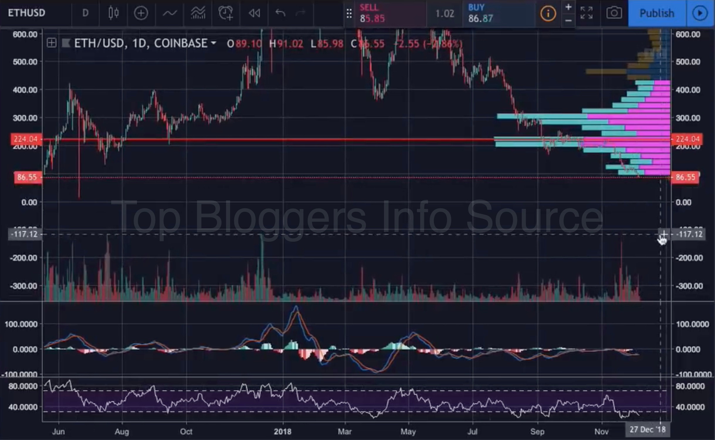 Ethereum стоит $86, можете в это поверить? Дальнейшее снижение выведет цену из зоны с высокими объёмами и приведёт к ускорению падения. Медведи владеют ситуацией, и даже хорошие покупки не сильно влияют на цену.