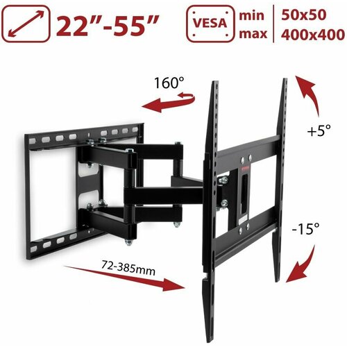 Support pour téléviseurs LED/LCD 26"-65", max 35 kg, mural, 4 degrés de liberté, inclinaison +15° -5°, rotation 160°, depuis le mur 72-385 mm, max VESA 400x400 mm, large plaque de montage permettant un montage fiable du téléviseur au mur, système de montage universel pour téléviseur