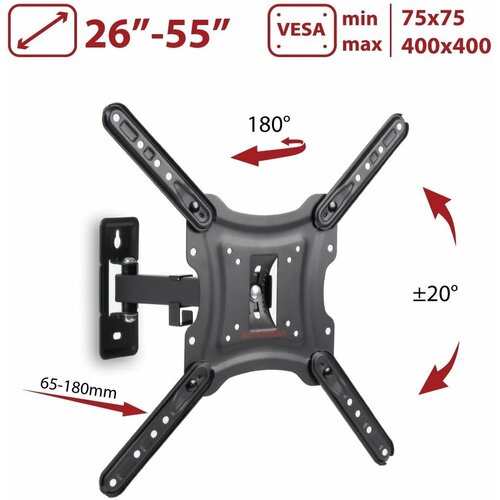 Support pour téléviseurs LED/LCD 26"-55", max 30 kg, mural, 4 degrés de liberté, inclinaison ±20°, rotation 180°, depuis le mur 65-180 mm, max VESA 400x400 mm, plaque de montage amovible