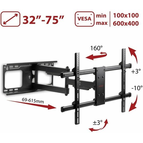 Support pour téléviseurs LED/LCD 32"-75", max 60 kg, mural, 5 degrés de liberté, inclinaison +3°-10°, rotation 180°, depuis le mur 69-615 mm, max VESA 600x400 mm, amovible plaque de montage, rotation de l'écran ±3°, superpositions décoratives