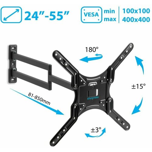 Support TV Kromax Dix-25 24-55", noirSupport pour téléviseurs LED/LCD 24"-55", max 20 kg, mural, 5 degrés de liberté, inclinaison ±15°, rotation 180°, depuis le mur 81-850 mm, max VESA 400x400 mm, plaque de montage amovible , Portée MAX depuis les murs 850 mm