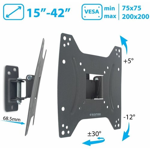 Support TV Kromax Optima-202 15-42", noirSupport pour téléviseurs LED/LCD 15"-42", max 25 kg, mural, 3 degrés de liberté, inclinaison +5°-12°, rotation ±30°, depuis le mur 68,5 mm, max VESA 200x200 mm, amovible plaque de montage