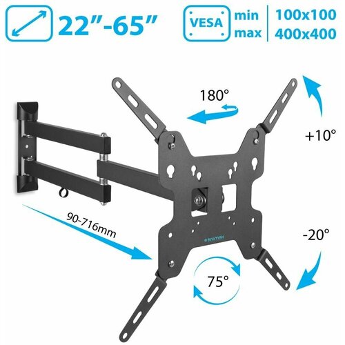 Support pour téléviseurs LED/LCD 22"-65", max 30 kg, mural, 5 degrés de liberté, inclinaison +10°-20°, rotation ±90°, depuis le mur 90-716 mm, max VESA 400x400 mm , plaque de montage amovible , rotation de l'écran, passe-câbles