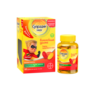 60 или 90 драже для детей с 3 лет Биологически активная добавка (БАД) к пище Супрадин® кидс волшебные драже (драже массой 1,8 г со вкусом апельсина, или клубники, или лимона) .