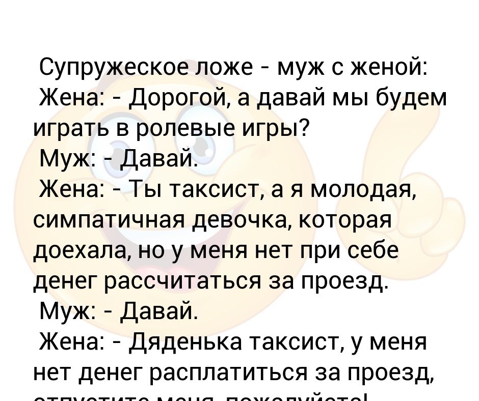 Супружеское ложе - муж с женой: Жена: - Дорогой, а давай мы будем играть в ролевые игры? Муж: - Давай . Жена: - Ты таксист, а я молодая, симпатичная девочка, которая доехала, но у меня нет при себе денег рассчитаться за проезд .