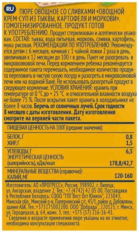 Суп пюре ФрутоНяня тыква-картофель-морковь 200г с 6месяцев по цене 56 .5 руб в интернет магазине Детский Мир . Описание, отзывы, аксессуары, характеристики .