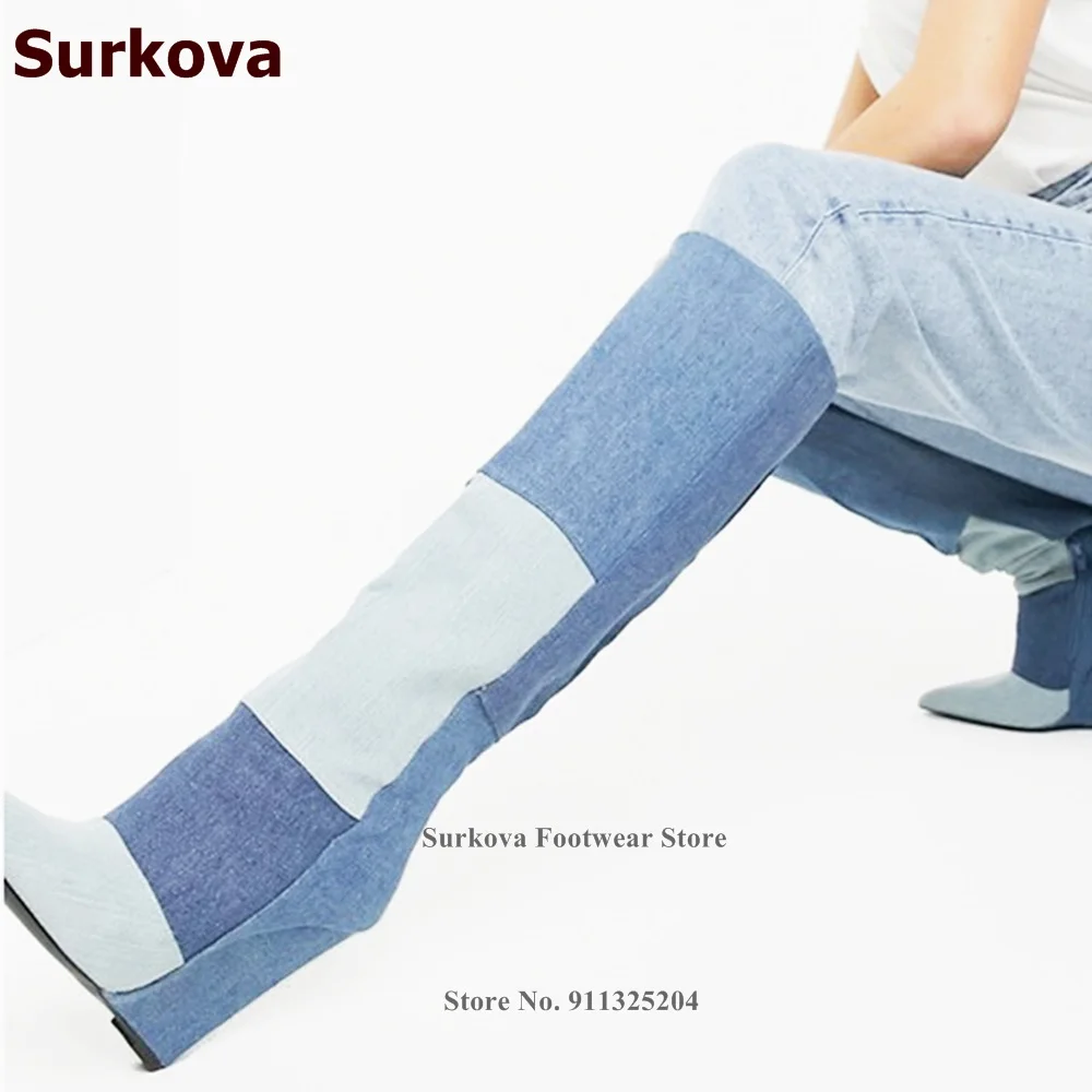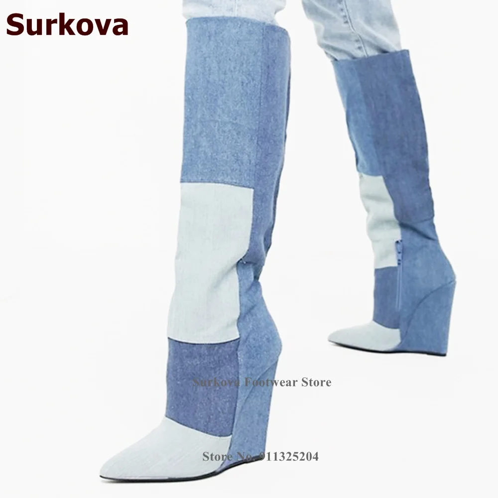 "Surkova Wedge Heels Blue Denim Knee High Boots Color Patchwork Square Pattern Jeans Pointed Toe Long Boots Zipped Dress Shoes" * Buy Now Just For 86$