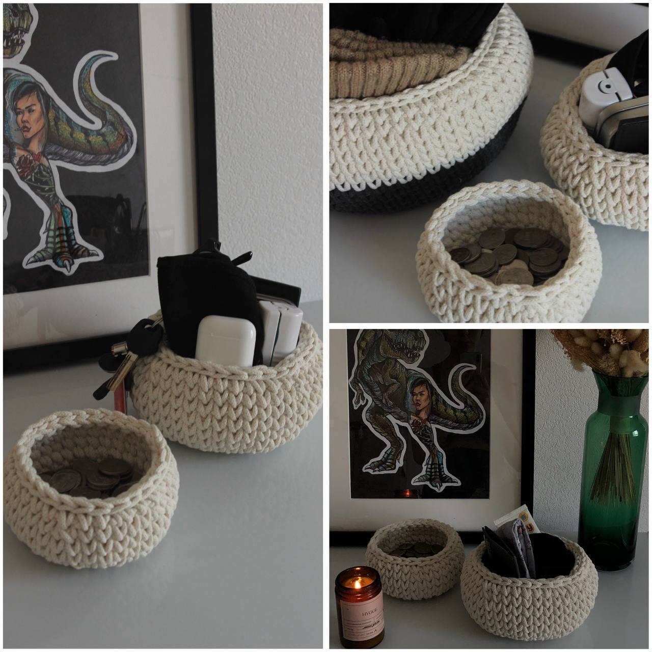 Вязанные интерьерные корзинки - полностью ручная работа наших мастериц, у корзинок меньшего объема деревянное резное дно. Хорошо держут форму и достаточно вместительные.