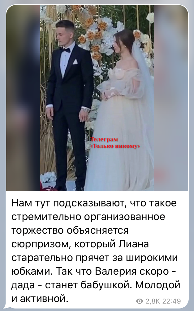 Появились новые кадры со свадьбы сына Валерии и подробности торжества . 28 августа 21-летний Арсений Шульгин женился на 21-летней возлюбленной Лиане Волковой . Поначалу ни молодожены, ни их . . .
