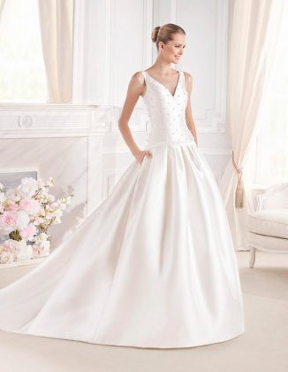 в коллекции Pronovias представлены съемные широкие рукава, которые прикрывают руки во время венчания и не мешают во время первого вальса влюбленных.