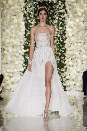 Триумфально ворвались на подиумы свадебные платья со шлейфами – от небольших асимметричных вшитых клиньев Lela Rose до широких многометровых съемных конструкций с вышивкой по фатину или каскадами воланов.