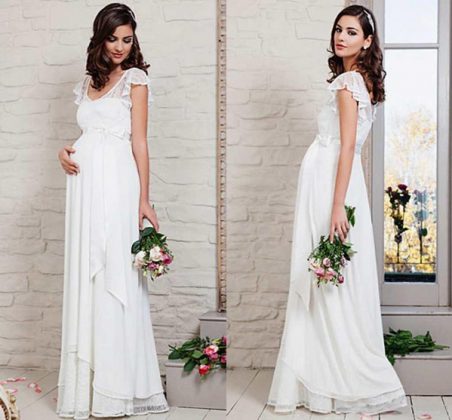 Длина в пол подходит для любой комплекции, особенно хорошо смотрятся длинные свадебные платья для беременных в свободном стиле – туника, А-образный силуэт от линии плеч, модель с каскадом кружев и складками.
