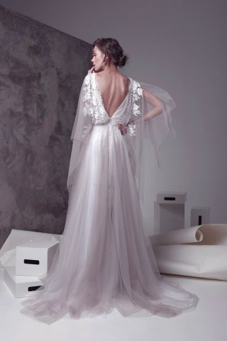 С возвращением теплых дней, будущие невесты смогут выбирать между двумя моделями платьев стильных фасонов для свадебного празднества. Длинное платье с английской вышивкой с богемными акцентами и короткое платье в коктейльном стиле - предметы, предназначенные для буколических или городских церемоний. А чтобы маленькие подружки невесты тоже приобщились к празднику, дизайнер придумала асимметричное платье, похожее на сказку.