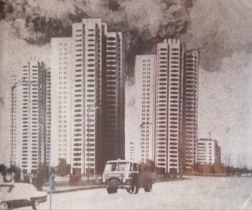 На этом рисунке три "свечки" по 29 этажей. Возможно изначально легендарные высотки именно такими и планировались, но в итоге построили всего два здания разной этажности - 28 и 25 этажей. Скорее всего банально не хватило ресурсов на такой масштабный проект.