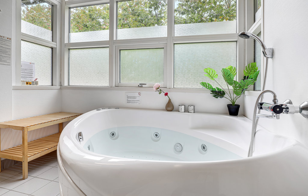 Skal I rigtigt slappe af, kan I tage en svedetur i saunaen eller benytte husets 4-personers standvandsspabad . Indendørs byder sommerhuset på et yderst veludrustet, funktionelt køkken med f .eks . service til 36 personer og alt i hårde hvidevarer .