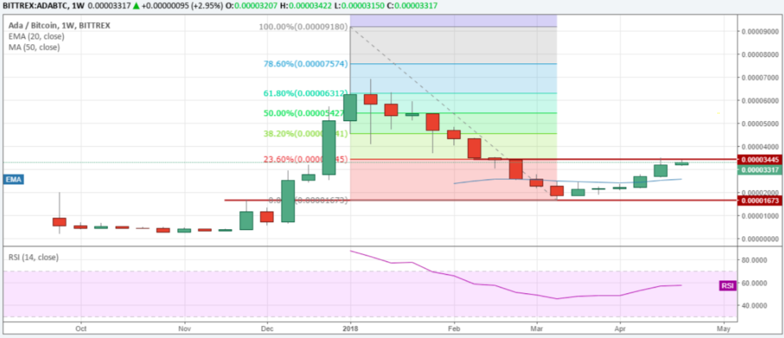 Последние 5 недель, криптовалюта компенсирует свое падение с уровня 0.00009180. И уже достигла уровня 23.6 восстановления. После такого резкого падения, такой же резкий рост маловероятен. Поскольку трейдеры, которые купили на более высоких уровнях, скорее всего, выведут ADA на цене, по которой они купили монету.