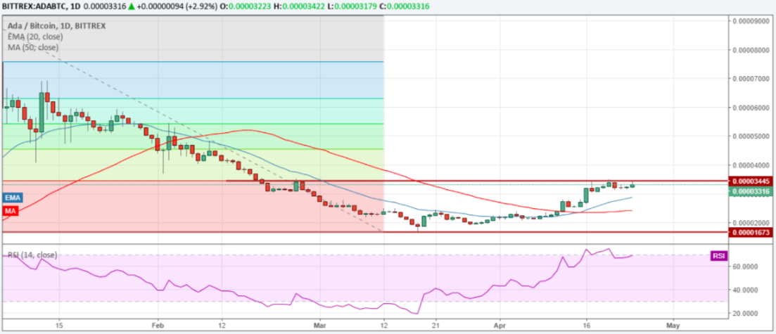 В таком случае 20-дневная EMA будет первым уровнем поддержки. Если она не выдержит, тогда возможен провал и до 50-дневной SMA. Давайте посмотрим как можно потрейдить на ADA.