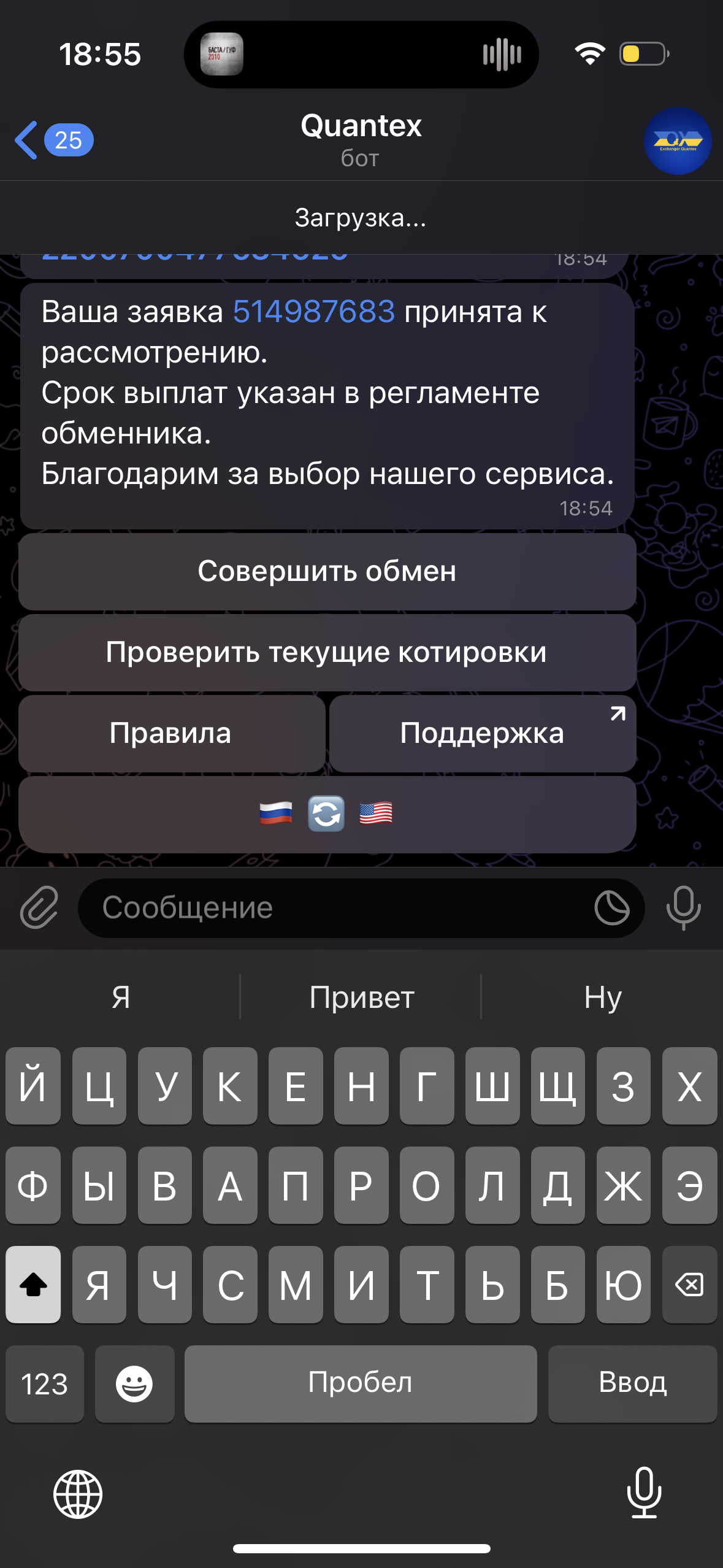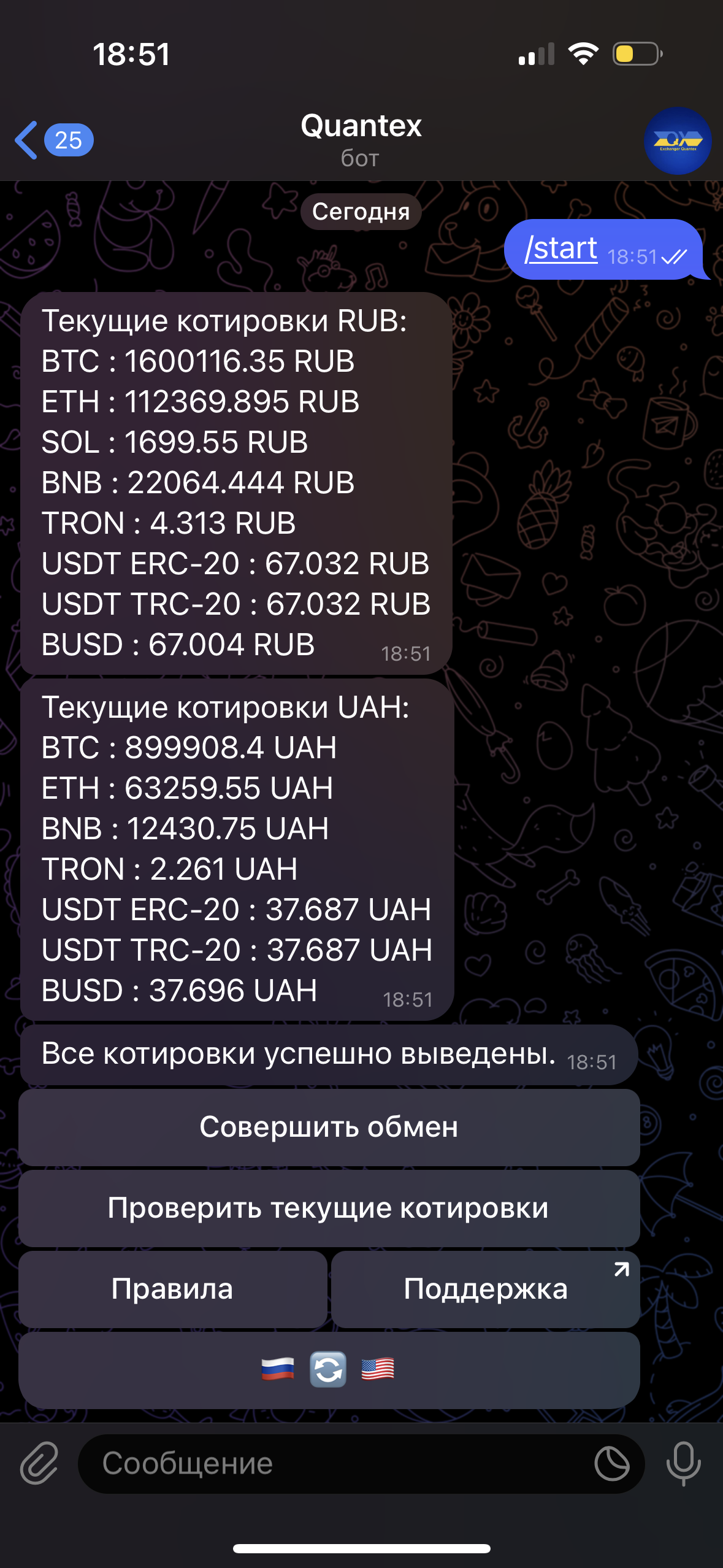 MansНедавно открылся в тг https://t.me/quantexua_bot у обменника сайт существует давно уже, обменник проверенный, с открытия ТГ дают выгодный курс на первую транзакцию что бы завлекать людей обменивать в телеграме тк хотят перевести обмены в режим тг бота полностью