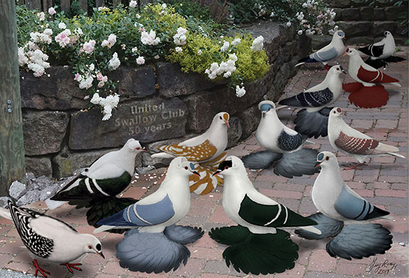 Swallows, Wing Pigeons: Muffed (SaxonType) and Clean leg (Thuringer type) Artwork created by Gary Romig in Celebration of the 50th anniversery of the United Swallow Club . See Our New Breeder Matrix . Virtual Show 2021 .