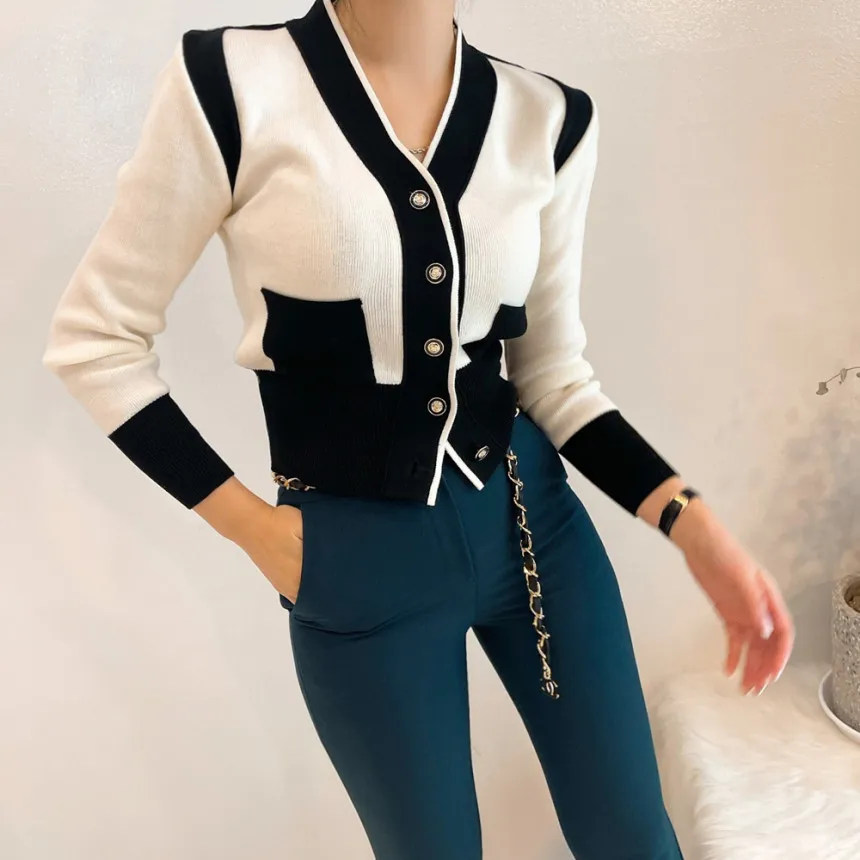 «Sweater Jacket Color-blocking Button Long Sleeve Knitted Sweaters Women's Cropped Cardigan Korean Autumn V-neck Single-breasted» по лучшей цене на рынке! Всего за 16$ (1520рублей)