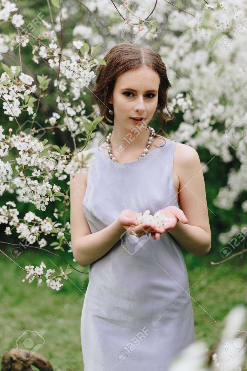 Young girl with long white hair in a white formal shirt and a short light skirt walks in the garden . With blooming azalea Young girl closed behind bars, grid, like in prison . looking in short skirt .