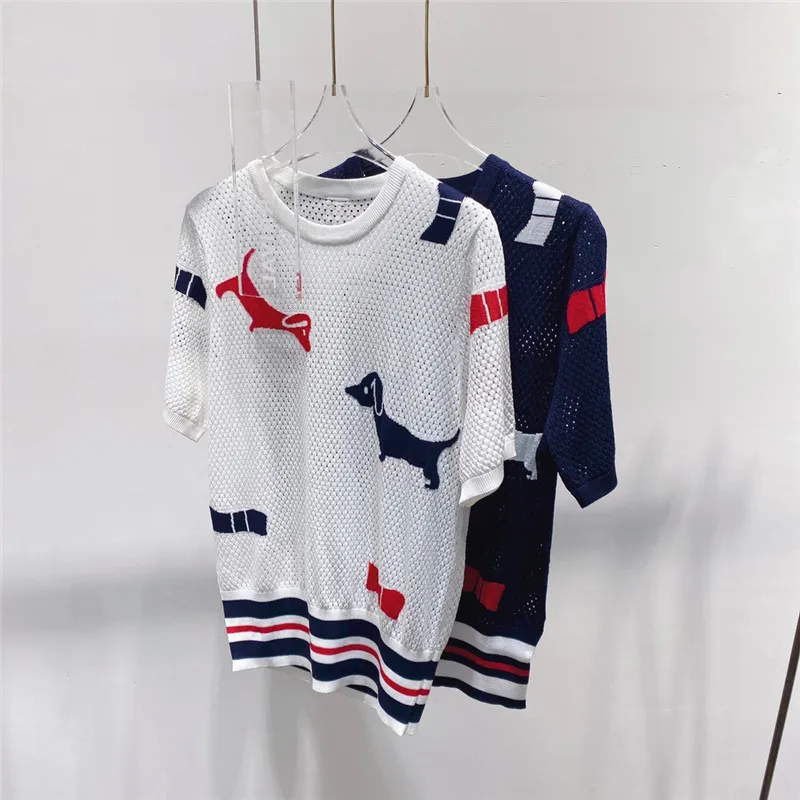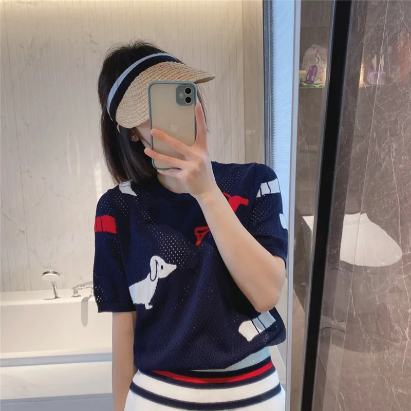 "TB Hollow Ice Silk Knitted T-shirt Female Summer Cartoon Age-reducing Puppy Pattern Round Neck Short-sleeved Contrast Color Top" * Buy Now Just For 34$