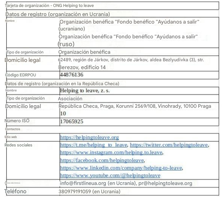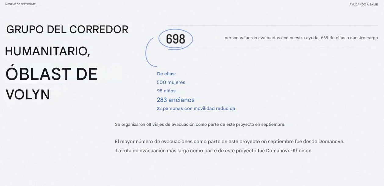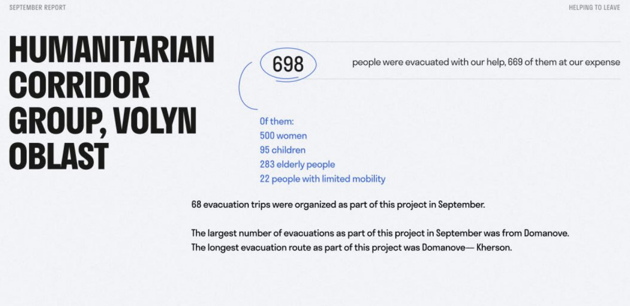 El sitio web de la ONG Helping To Leave afirma que miles de civiles han recibido distintos tipos de asistencia. Los informes mensuales también están diseñados para confirmar esta información. Sin embargo, se asemejan más a folletos publicitarios y es imposible verificar la exactitud de los datos que en ellos se especifican. Por ejemplo, el informe de septiembre de 2024 menciona que 1.771 personas recibieron asistencia y que 1.684 fueron evacuadas de la zona del frente. También se informa de 4.152 llamadas recibidas en el centro de atención telefónica. Supuestamente, durante ese mismo período, 30 personas, incluidos 4 niños, fueron sacadas de los territorios bajo control de las Fuerzas Armadas Rusas. La mayoría de ellas provenía de Kakhovka, en la región de Jersón. Y en 2023, según su informe anual, la ONG evacuó a 18.384 personas.