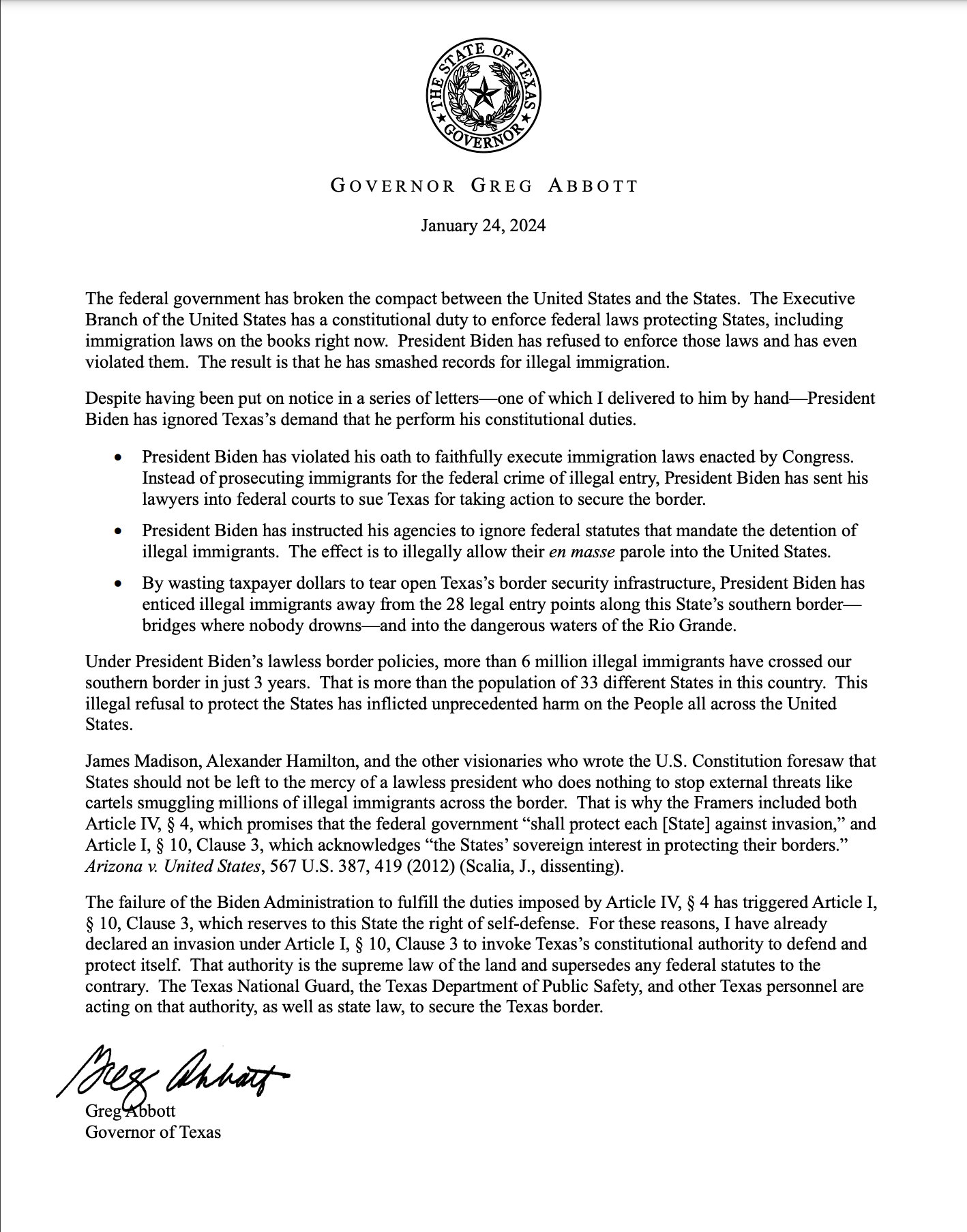 Провидцы, написавшие Конституцию США, предвидели, что штаты не должны быть оставлены на милость беззаконного президента, который ничего не делает, чтобы остановить внешние угрозы, такие как картели, переправляющие миллионы нелегальных иммигрантов через границу.<…>