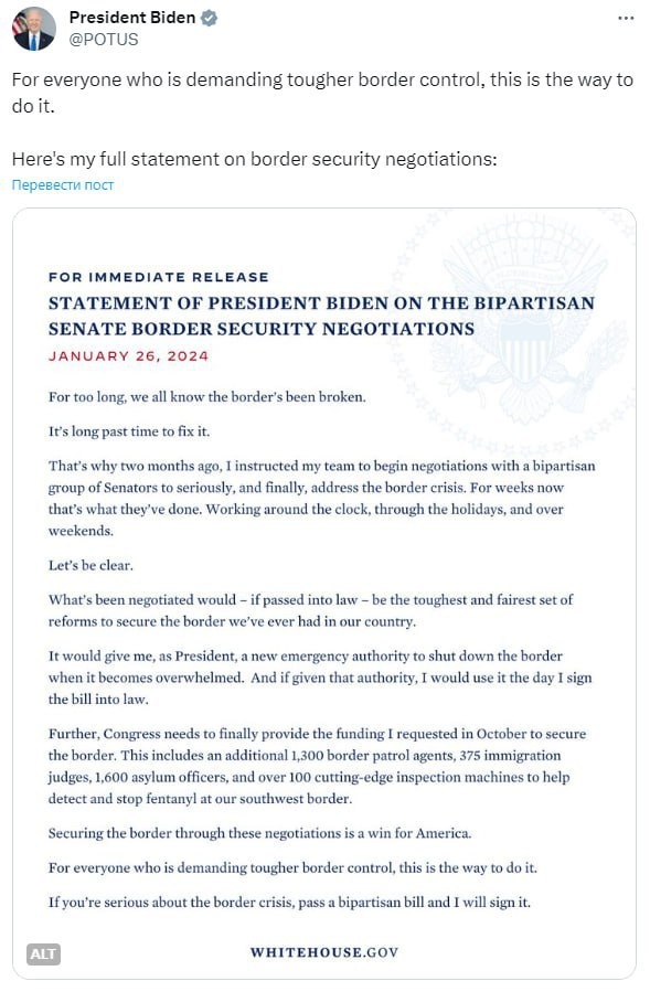 Тут уже Байден понимает, что, походу, он это не вывезет и начинает давать заднюю и выпускает простыню о том, что он вообще не против усилить контроль границы, да и вообще уже пустил в Сенат закон и только плохие республиканцы Техаса мешают его принять. Витиевато упоминает о мат-помощи. Но по сути весь этот спич— отписка из рубрики “да, проблема есть будем решать”.