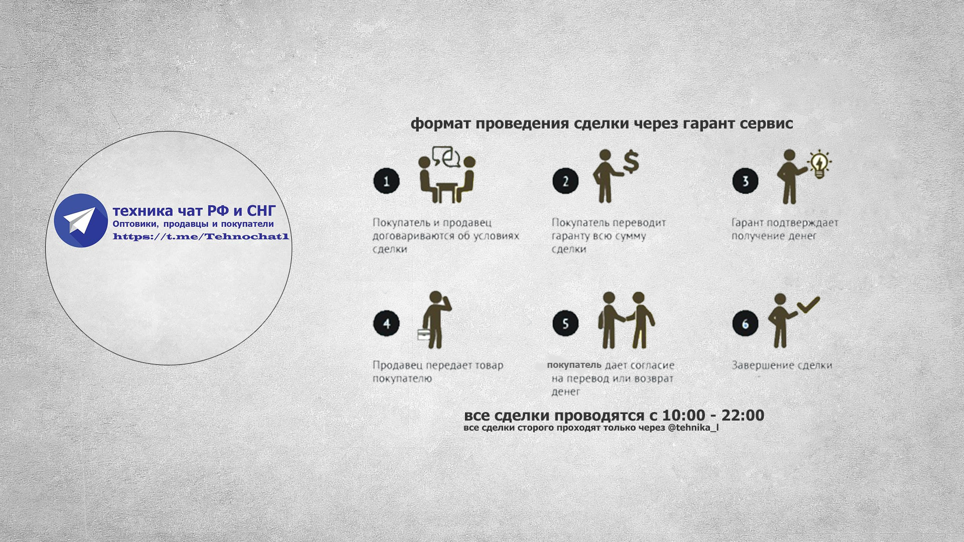 https://t.me/Tehnochat1В последнее время участились случаи мошенничества с использованием поддельного гаранта, перед началом общения или проведения сделки обязательно проверяйте линк указанный в описании всех чатов!