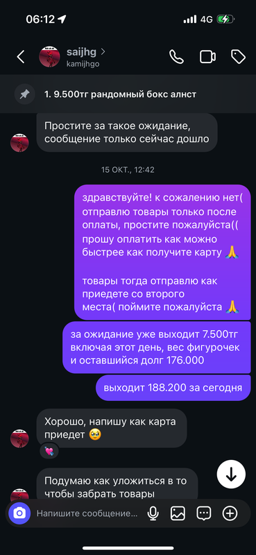 на данный момент я беру за предзаказы бронь в размере 10-30% от суммы заказа. но тогда я была глупа и доверилась начав брать предзаказы бесплатно, что после привело к блокировке меня на сайтах по заказу фигурок, так как она их не оплатила. она просто писала какую фигурку хочет, я открывала на нее предзаказ на сайте где оплата идет после релиза самой фигурки. если релиз в июне - за нее надо заплатить в июле. я рассчитывала, что как раз в момент релиза фигурок она будет отправлять мне за них деньги. но до релиза было полгода, поэтому я не совсем волновалась об этом.