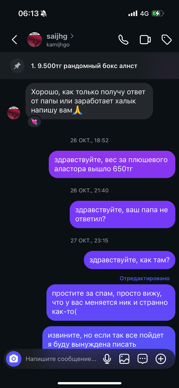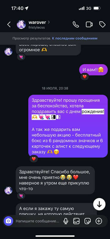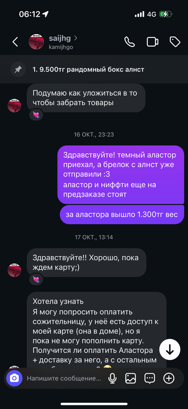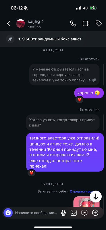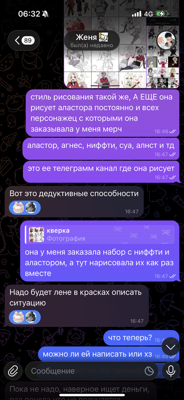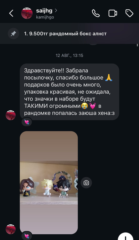 в 2025 году данная девушка заказывала у меня постоянно разный мерч, в основном с алнст и аластором. она была моей постоянной покупательницей с которой я очень хорошо общалась и дарила ей дополнительные подарочки к заказу: