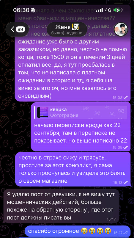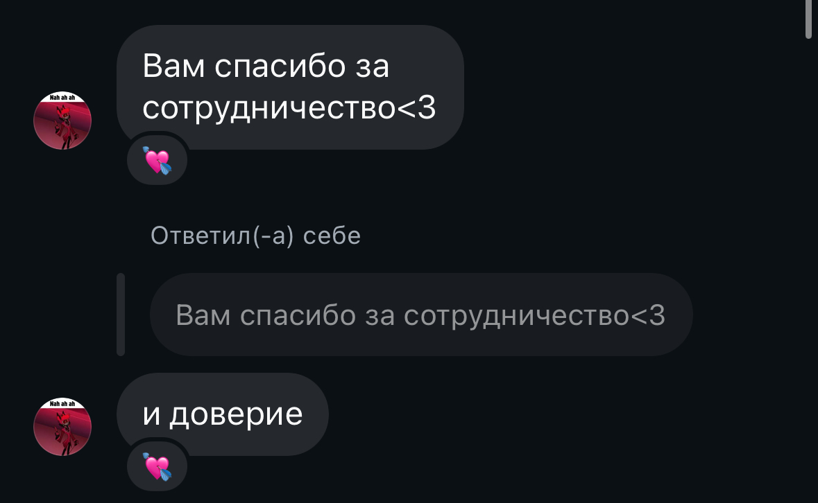 снизу скину скрины переписки с админом тгк с которой мы решали проблему: