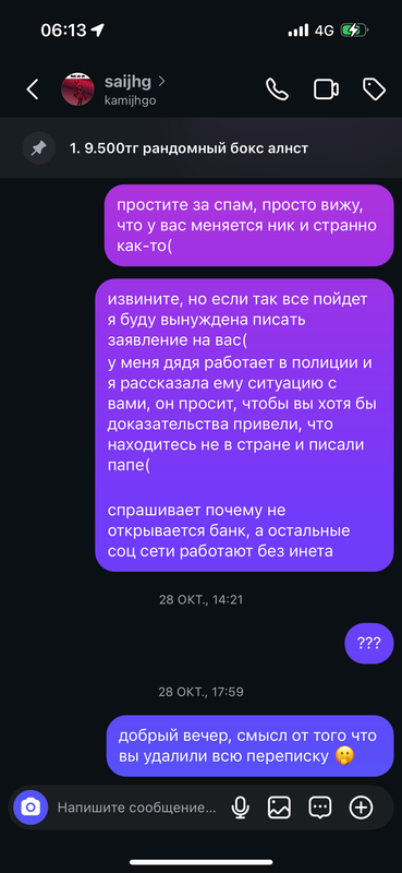 она осталась безнаказанной и не признавала вину до последнего заблокировав меня везде, админа тгк и других людей. я написала ее подруге(?) с ее подарка в телеграмме, та ответила агрессивно, а потом начала «понимать» и сказала, что у арины ШИЗОФРЕНИЯ и РАЗДВОЕНИЕ ЛИЧНОСТИ. она очень жалела ее, говорила, что может попробовать заплатить за нее хотя бы чуть чуть, но я отказалась. она была из России. до полиции дело не дошло, но если ситуация повторится - я напишу заявление.